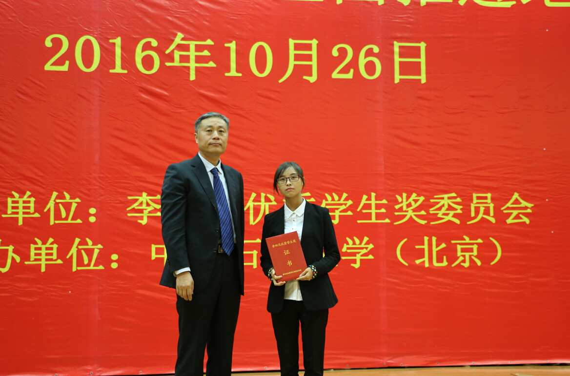 2016年10月26日下午,第七次李四光优秀学生奖颁奖大会在中国石油大学(北京)中油大厦三层报告厅隆重举行。国土资源部总工程师彭齐鸣,国土资源部科技与国际合作司司长、李四光优秀学生奖委员会副主任委员姜建军,中国地质调查局党组成员、中国地质科学院党委书记、副院长、李四光地质科学奖委员会秘书长王小烈,中国科学院院士王铁冠,教育部科学技术司副司长高润生,中国矿业大学(北京)校长杨仁树,中国地质大学(北京)副校长刘大锰,北京大学地球与空间科学学院名誉院长、李四光优秀学生奖委员会秘书长潘懋等出席了颁奖大会。21位获奖学生和700多名地质相关专业学生代表参加了颁奖大会。