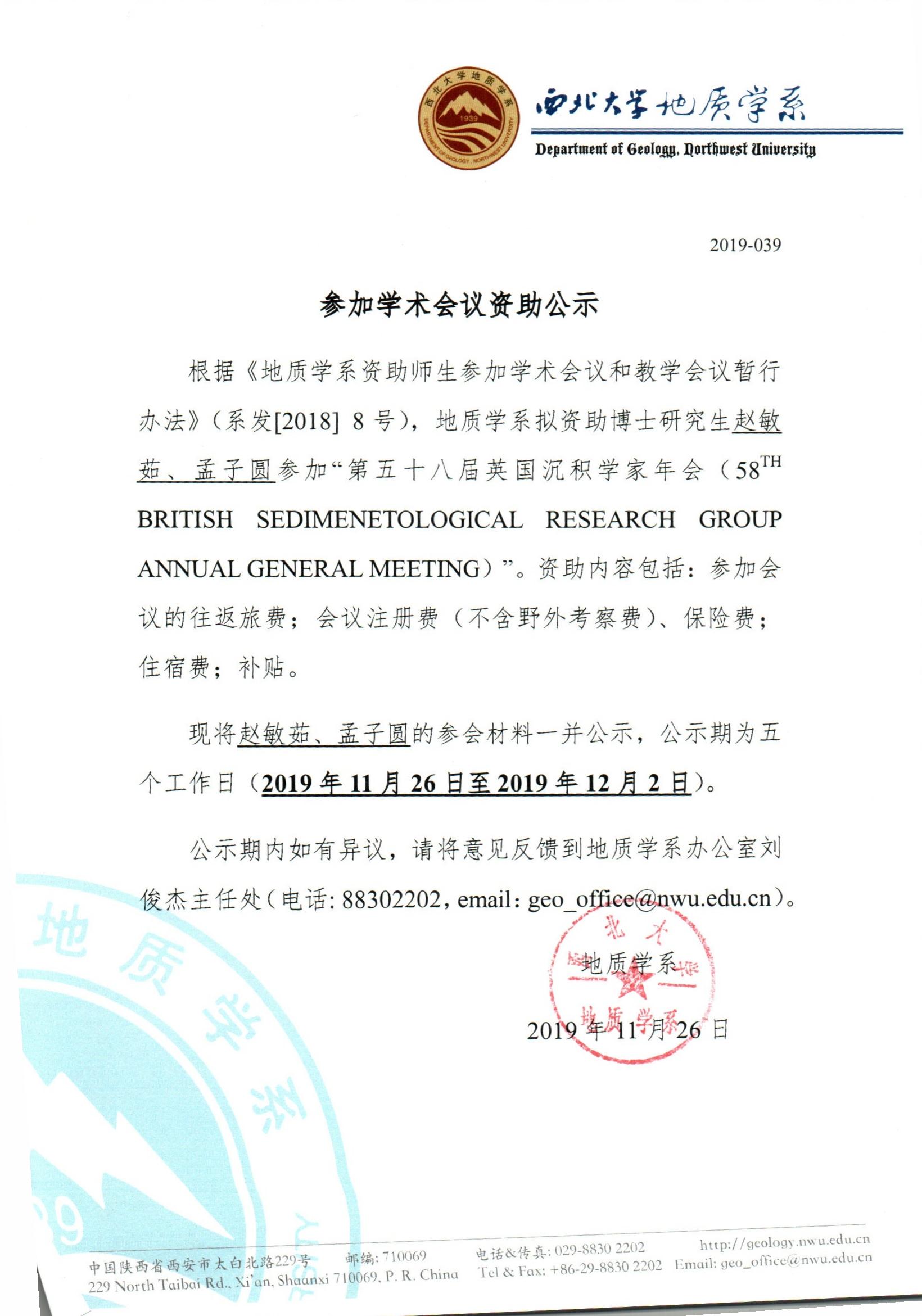 偷拍 关于资助博士研究生赵敏茹、孟子圆出国参加学术会议的公示