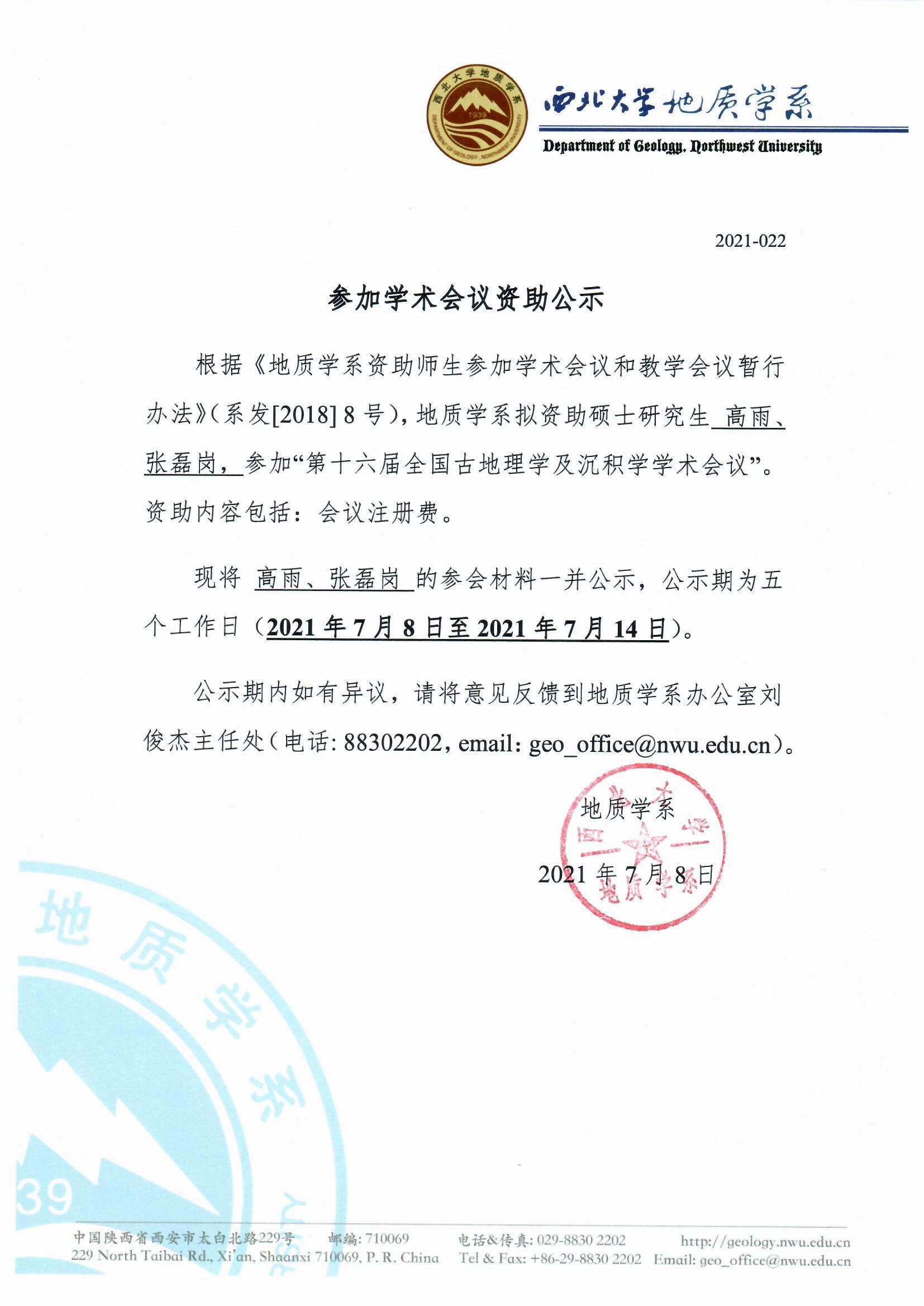 偷拍 关于资助硕士生高雨、张磊岗参加国内会议的公示
