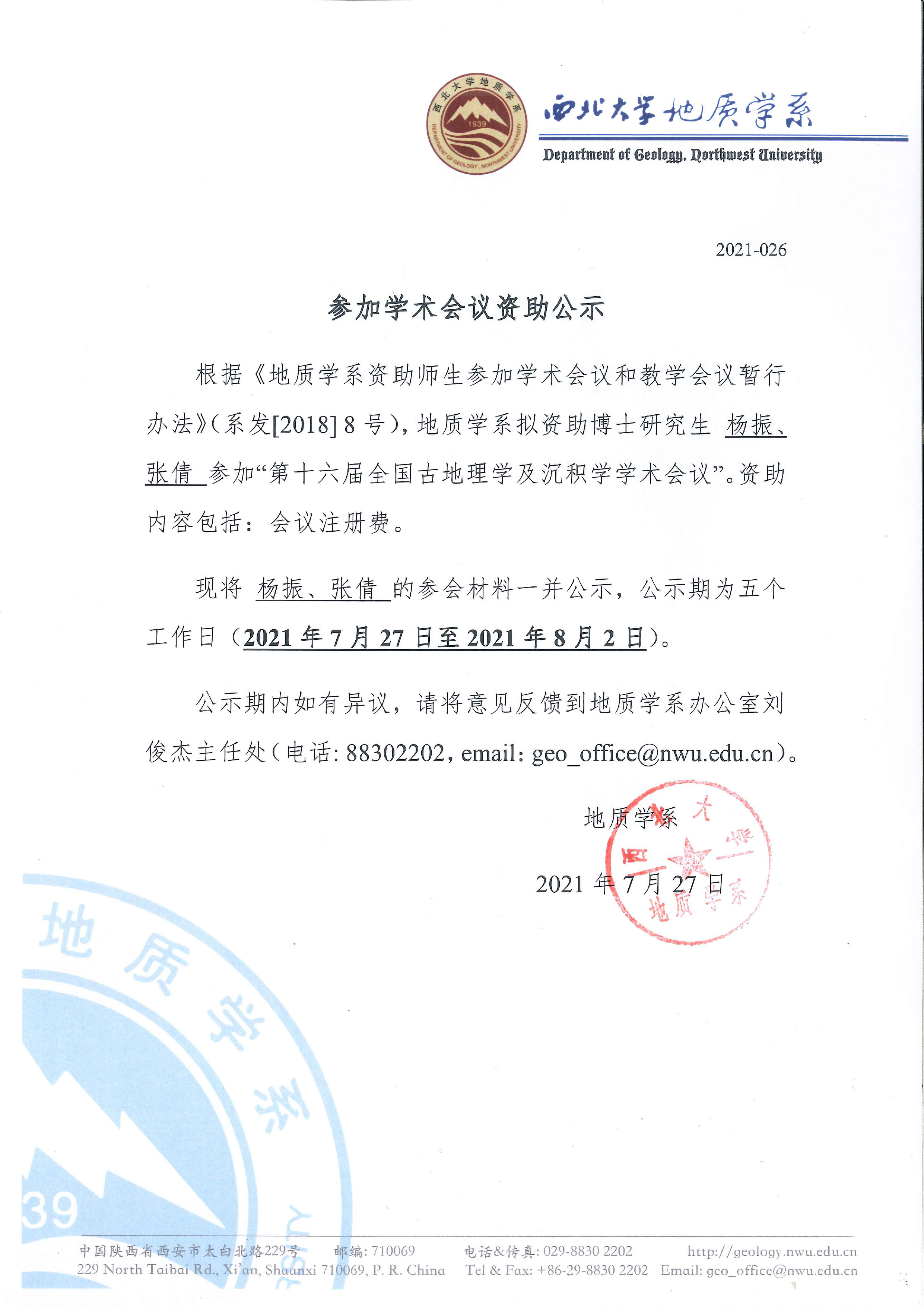 偷拍 关于资助博士研究生杨振、张倩参加国内会议的公示