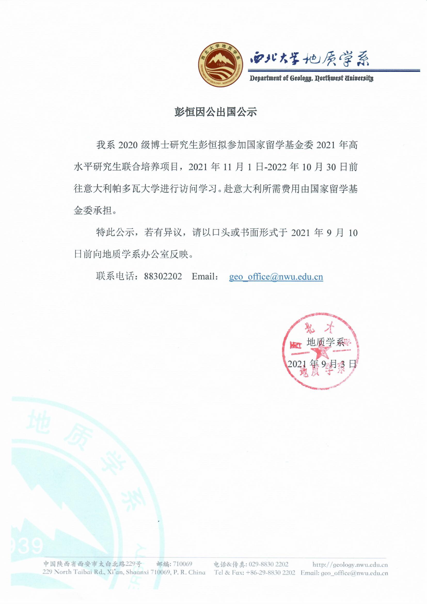彭恒因公出国公示