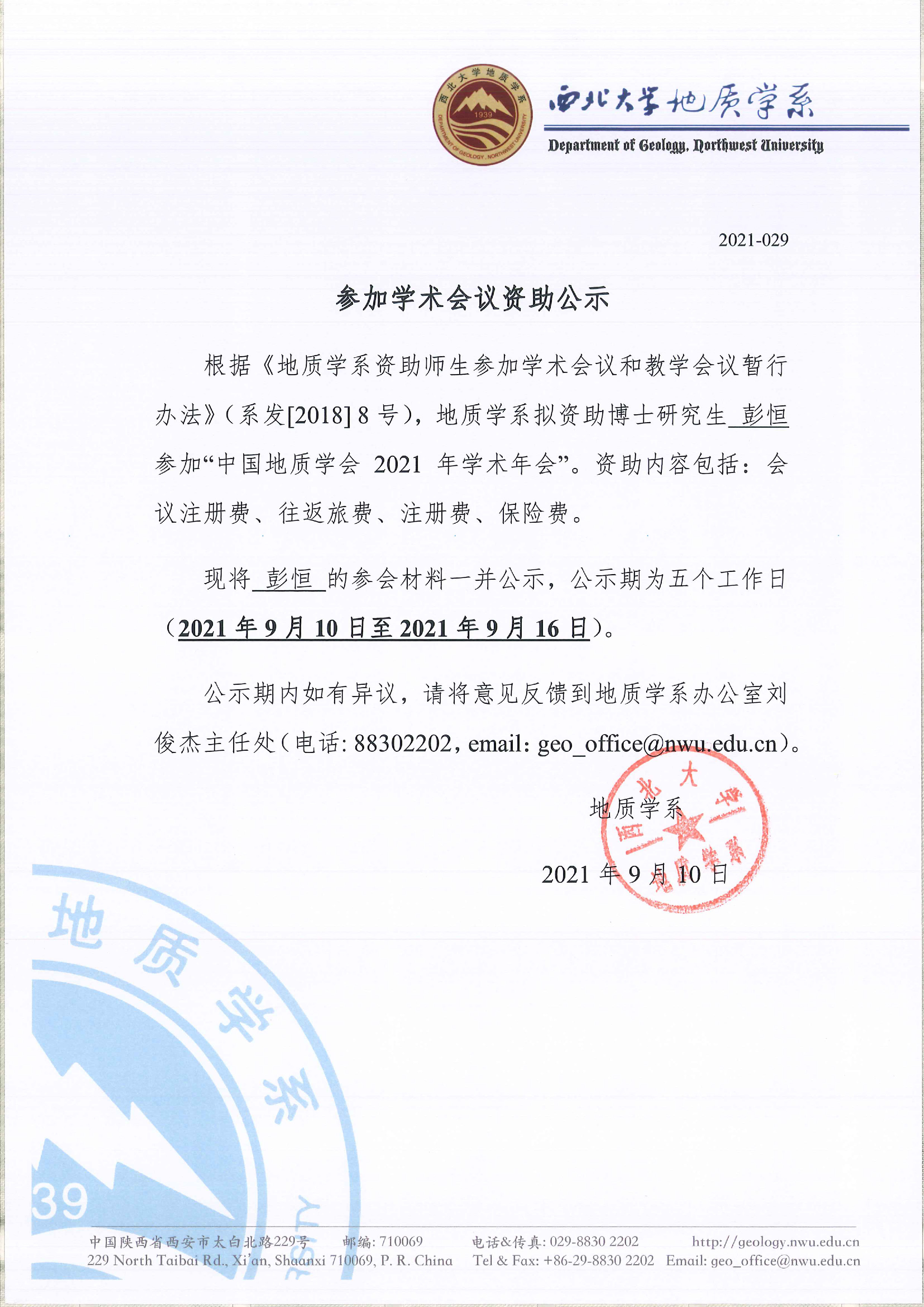 偷拍 关于资助博士研究生彭恒参加国内会议的公示