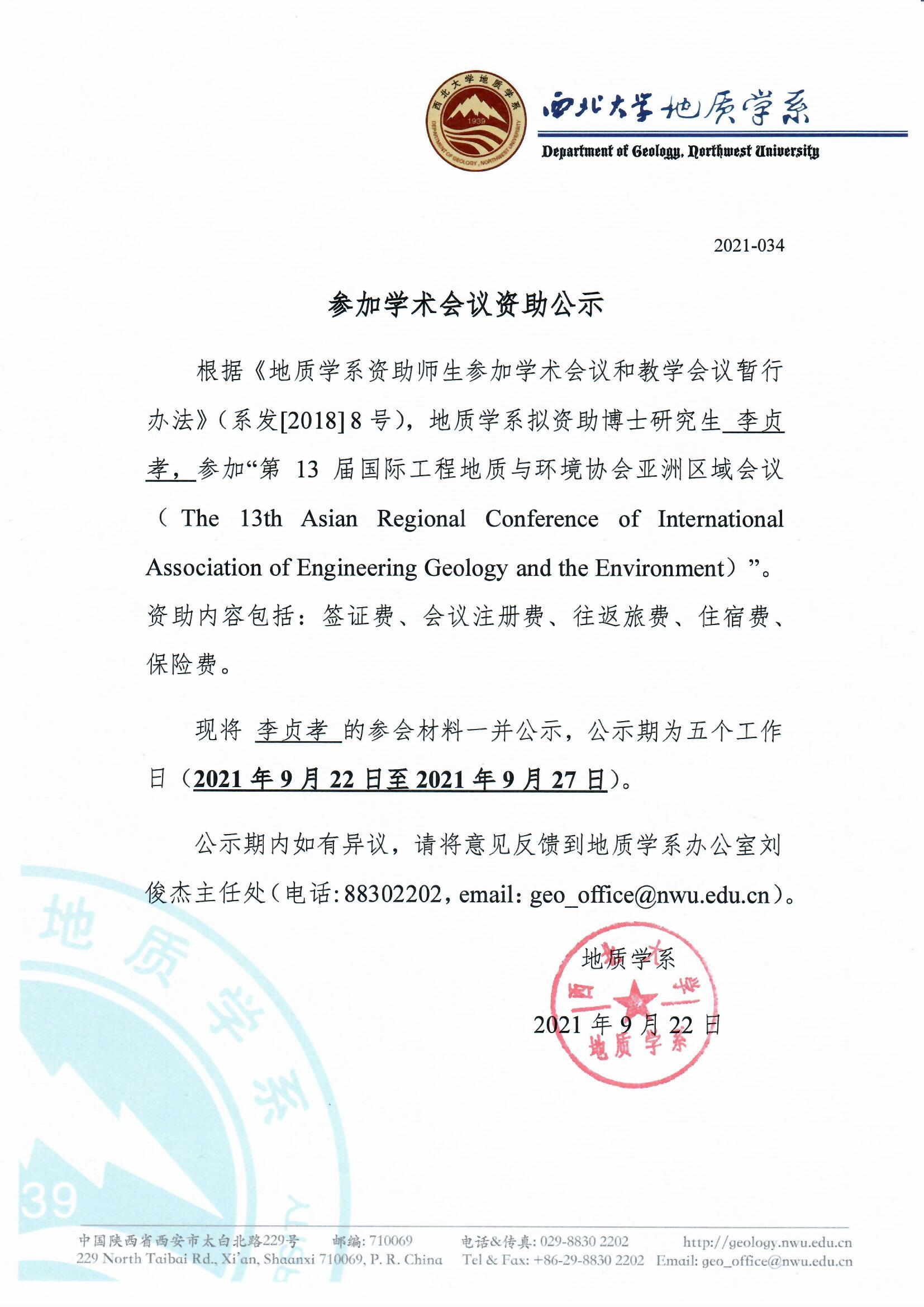 偷拍 关于资助博士研究生李贞孝参加国际会议的公示