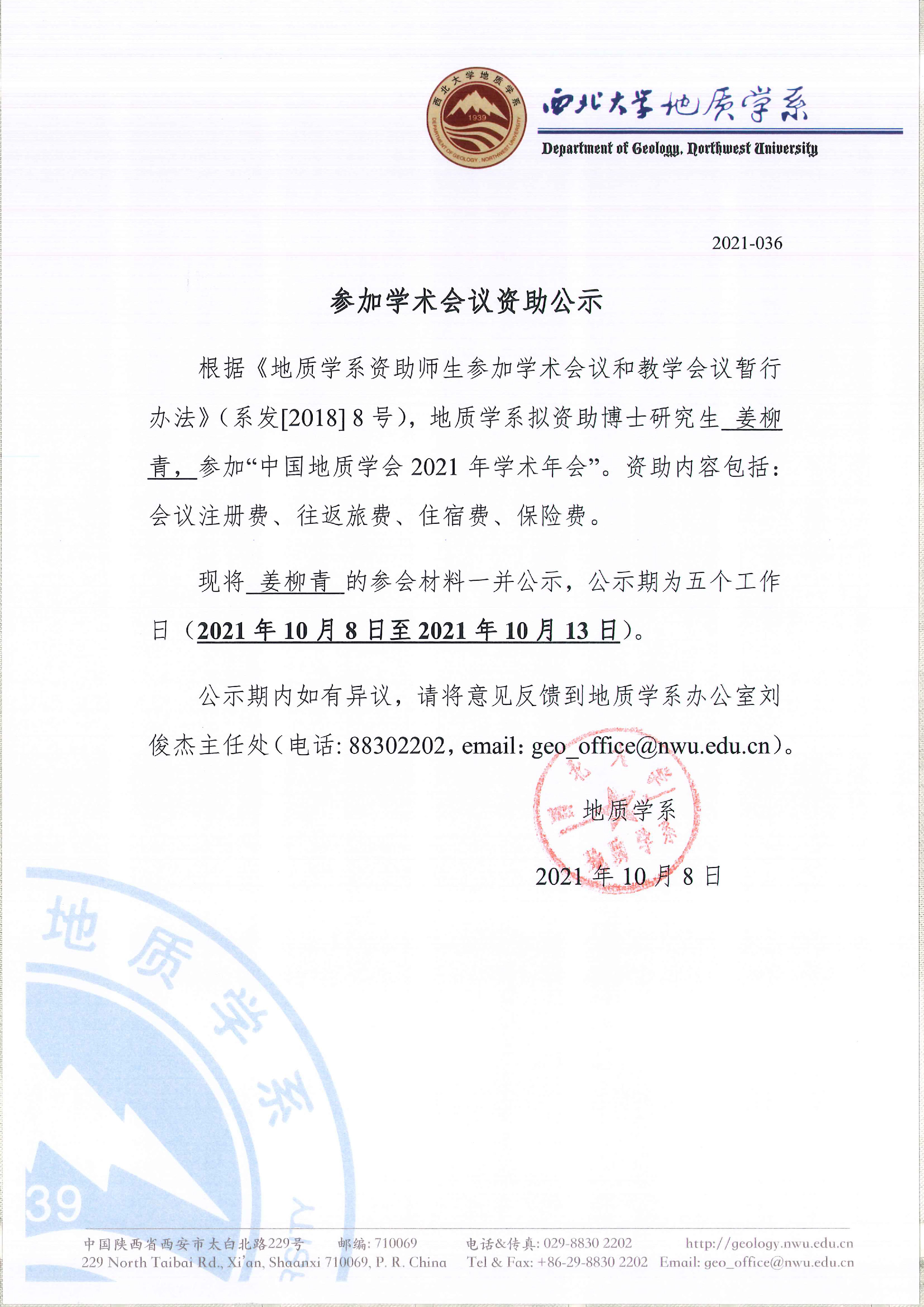 偷拍 关于资助博士研究生姜柳青参加国内会议的公示