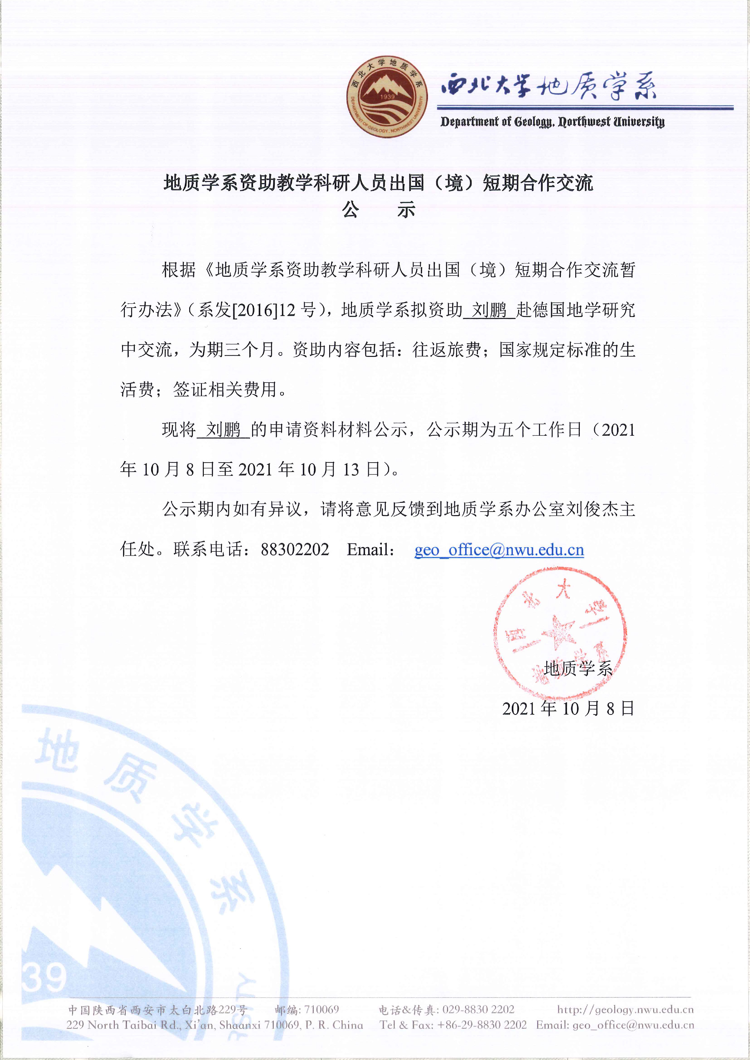 偷拍 关于资助教师刘鹏出国短期合作交流的公示
