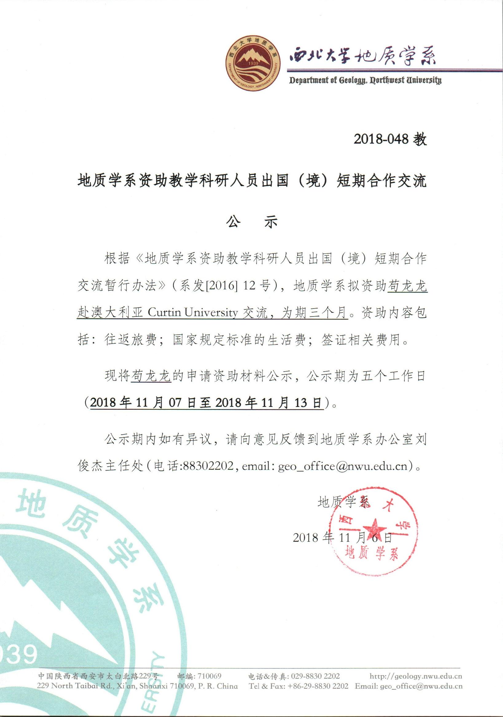 偷拍 关于资助苟龙龙副教授出国短期合作交流的公示